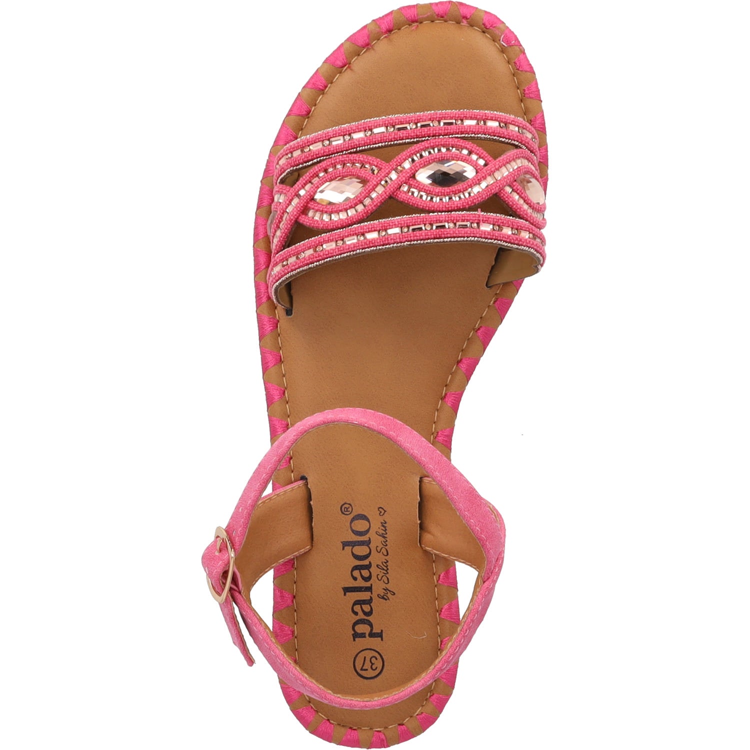 Ein Hauch von Boho-Charme für deine Sommergarderobe! Die Riemchensandale 'Naforao' aus der exklusiven Palado by Sila Sahin Kollektion besticht durch raffinierte Details. Der breite Zier-Riemen ist kunstvoll mit schimmernden Schmucksteinen und feinen Stickereien verziert, während die markante Naht entlang der Sohle einen modischen Akzent setzt. Der schmale Fesselriemen mit Dornschließe sorgt für perfekten Halt und unterstreicht die feminine Silhouette. Ein Must-Have für warme Tage – modisch, bequem und vielseitig kombinierbar.