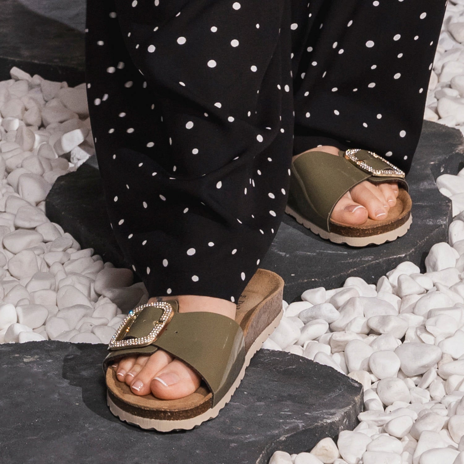 Der „Palado Malta BX“ aus der Palado by Sila Sahin Kollektion bringt einen Hauch von Glamour in die klassische Einriemer-Sandale. Mit einer Decksohle aus weichem Veloursleder und einer strapazierfähigen Laufsohle aus EVA, vereint dieses Modell Komfort mit Stil. Der hochwertige Synthetikriemen wird durch eine große Glitzerschnalle akzentuiert, die mit ihren abgerundeten Ecken sowohl modern als auch auffällig ist. Ein trendiges Must-Have für den Sommer, das sowohl zum Strandoutfit als auch zur Abendgarderobe passt und in keinem Schuhschrank fehlen sollte.