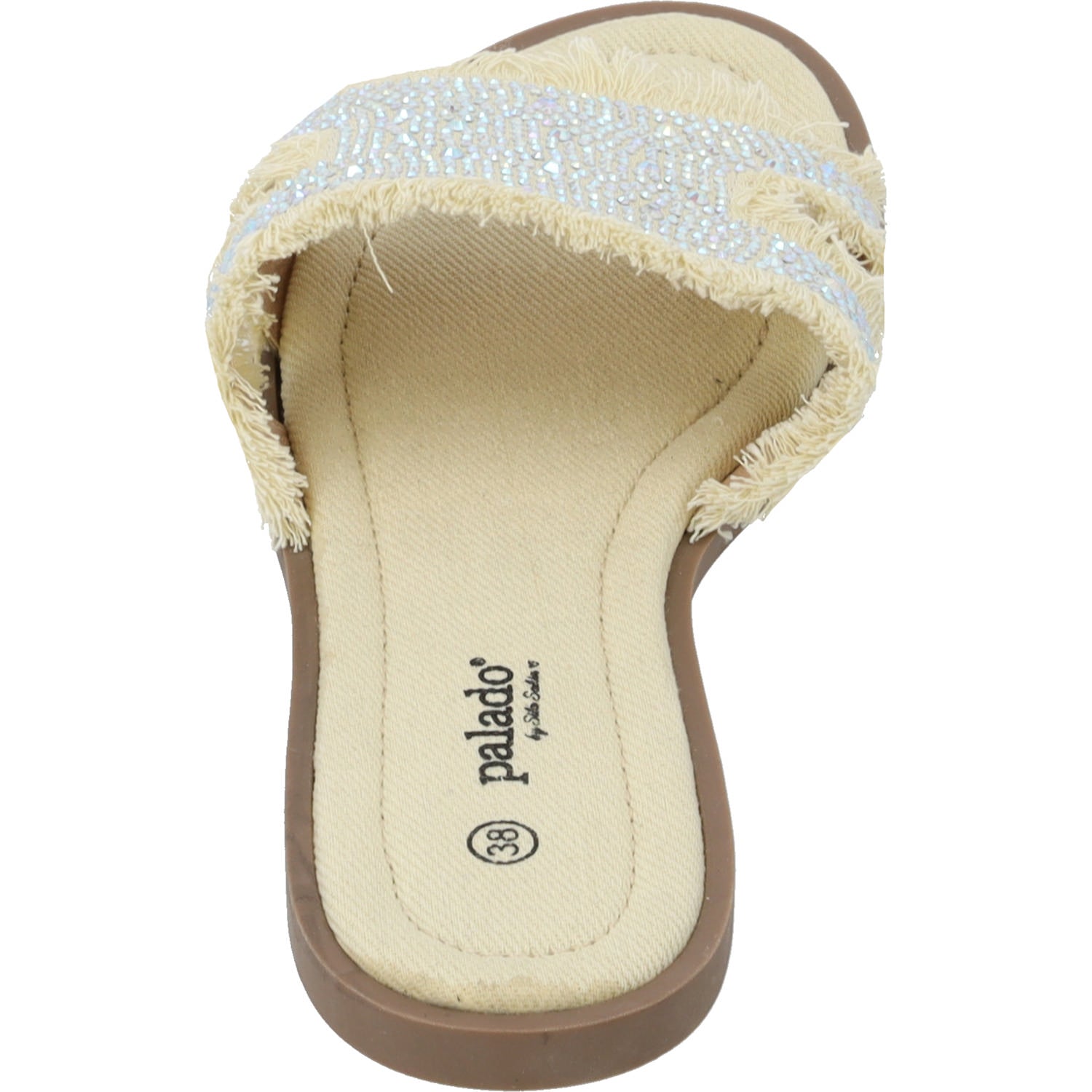 Die Slide-Sandale 'Palado Yinra' designed by Sila Sahin vereint glamouröse Details mit lässigem Design. Das Obermaterial in cooler Denim-Optik wird von funkelnden Strasssteinen und modischen Fransenakzenten veredelt. Die flache Sohle sorgt für ein angenehmes Laufgefühl – perfekt für ein Cappuccino-Date mit den Girls oder entspannte Stunden am Strand.